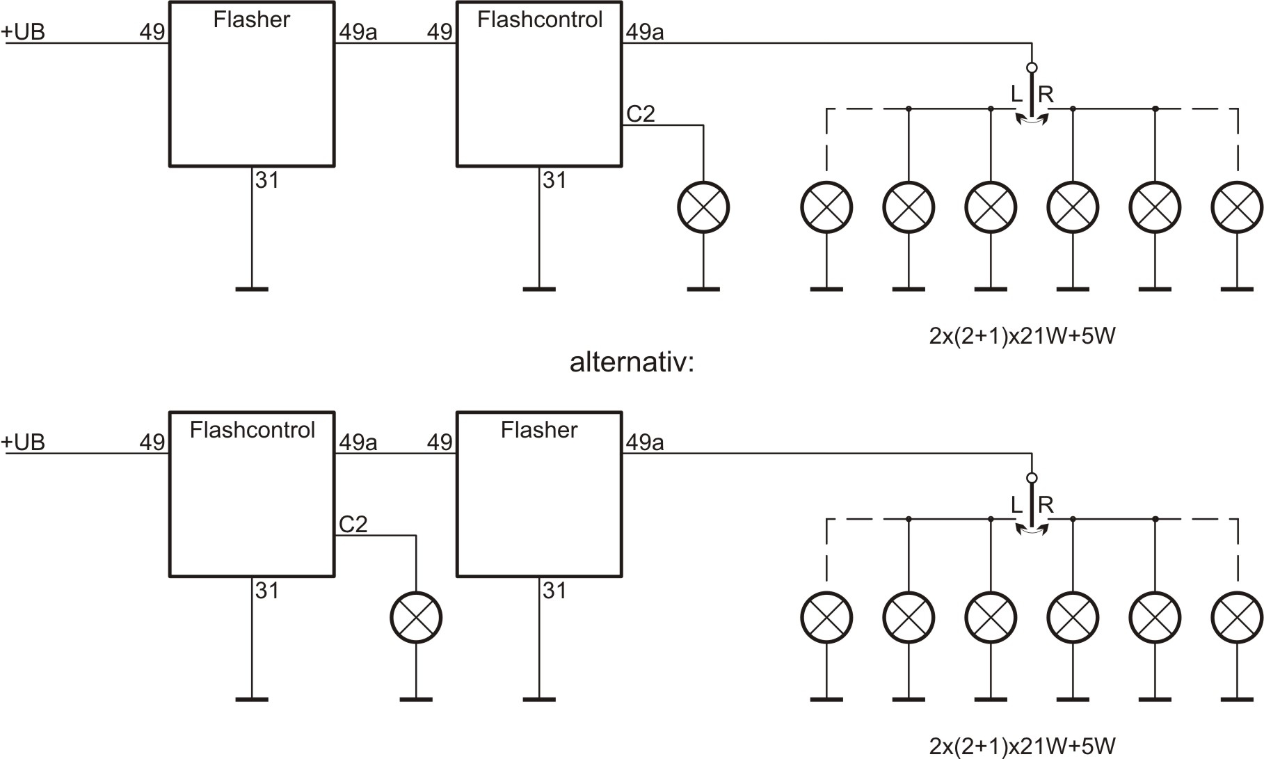 The flasher unit monitors the vehicle's turn signals and those of the trailer. If a third flashing lamp 21W is detected, this is signaled by output C2.
