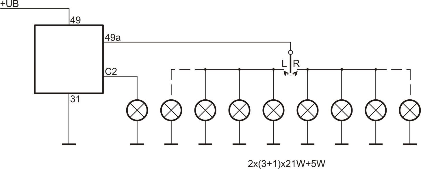 Der Blinkgeber überwacht die Fahrzeug Blinklampen sowie die des Anhängers. Wird eine vierte Blinklampe 21W erkannt, so wird das durch den Ausgang C2 signalisiert. Bei Unterschreitung von drei Blinklampen wird eine höhere Blinkfrequenz erzeugt.