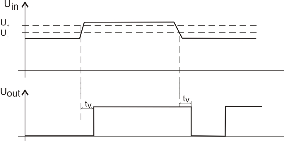 The voltage monitor switches the load on or off at a defined threshold voltage. The relay can also be closed via the APC input in order to also couple the batteries in the case of undervoltage. As long as the input is present, the relay is closed.