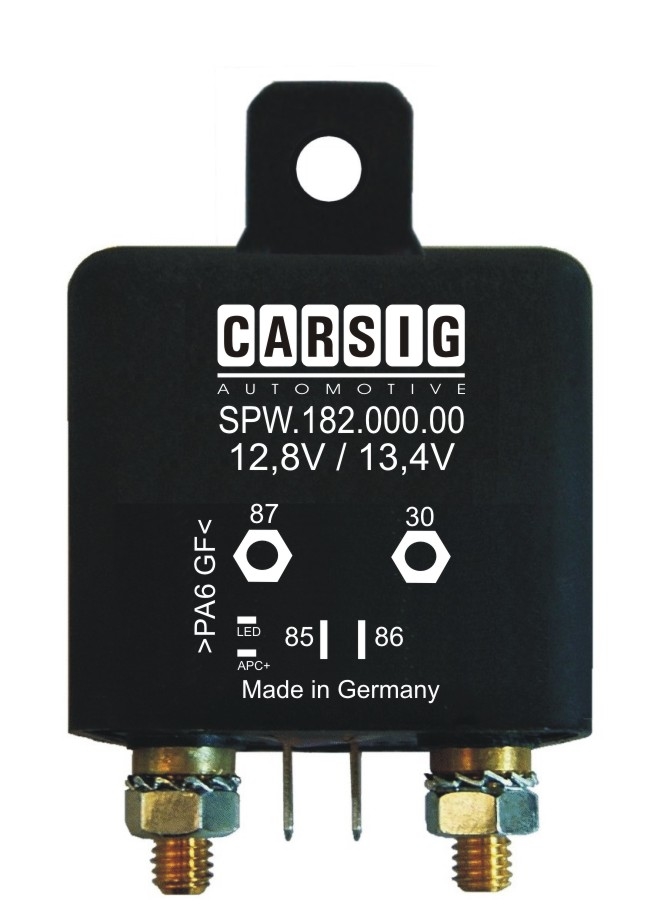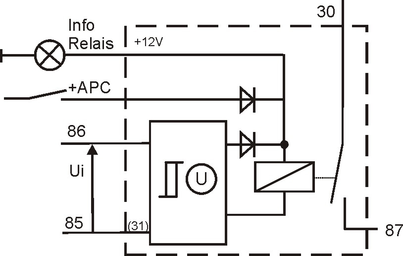 The voltage monitor switches the load on or off at a defined threshold voltage after the delay time has elapsed. Forced switching can be forced with the APC input. As long as the input is switched, the relay is switched through. A warning light can be connected to the info relay output.