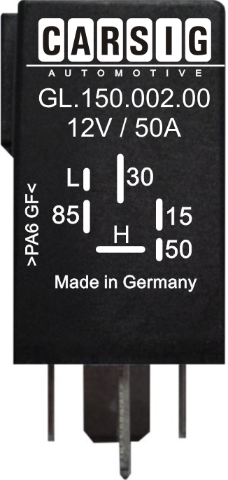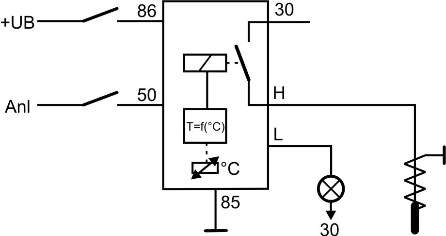 Nach dem Einschalten der Klemme 86 (Zündung) wird am Ausgang L (Lampe zum Anzeigen der Vorglühzeit) eine Abschaltverzögerung ausgeführt. An der Klemme 87 (Glühkerzen) liegt bis zum Start Pluspotential an. Wenn der Startvorgang beendet ist (Motor Läuft und Klemme 50 Spannungslos), fällt das Relais ab und Klemme 87 wird Spannungslos. Erfolgt kein Start, so schaltet das Relais nach Zeit (Sicherheitsabschaltung) ab. Glühzeit: 0 - 15sec.