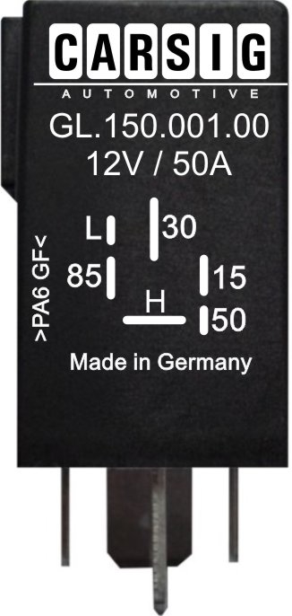 Nach dem Einschalten der Klemme 86 (Zündung) wird am Ausgang L (Lampe zum Anzeigen der Vorglühzeit) eine Abschaltverzögerung ausgeführt. An der Klemme 87 (Glühkerzen) liegt bis zum Start Pluspotential an. Wenn der Startvorgang beendet ist (Motor Läuft und Klemme 50 Spannungslos), fällt das Relais ab und Klemme 87 wird Spannungslos. Erfolgt kein Start, so schaltet das Relais nach Zeit (Sicherheitsabschaltung) ab. Glühzeit: 0 - 15sec.