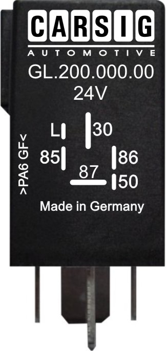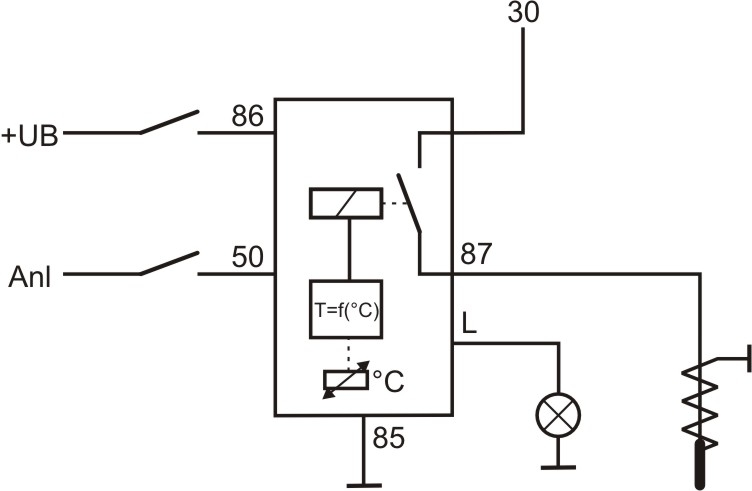 Nach Einschalten der Klemme 86 (Zündung) wird am Ausgang L (Lampe zum Anzeigen der Vorglühzeit) eine Abschaltverzögerung nach Kennlinie ausgeführt. An der Klemme 87 (Glühkerzen) liegt bis zum Start Pluspotential an. Wenn der Startvorgang beendet ist (Motor Läuft und Klemme 50 Spannungslos), fälltt das Relais ab und Klemme 87 wird Spannungslos. Erfolgt kein Start, so schaltet das Relais nach Kennlinie (Sicherheitsabschaltung) ab.