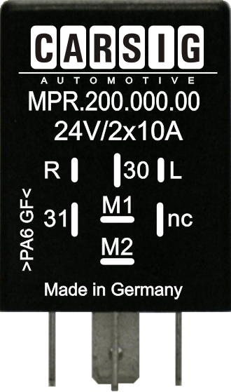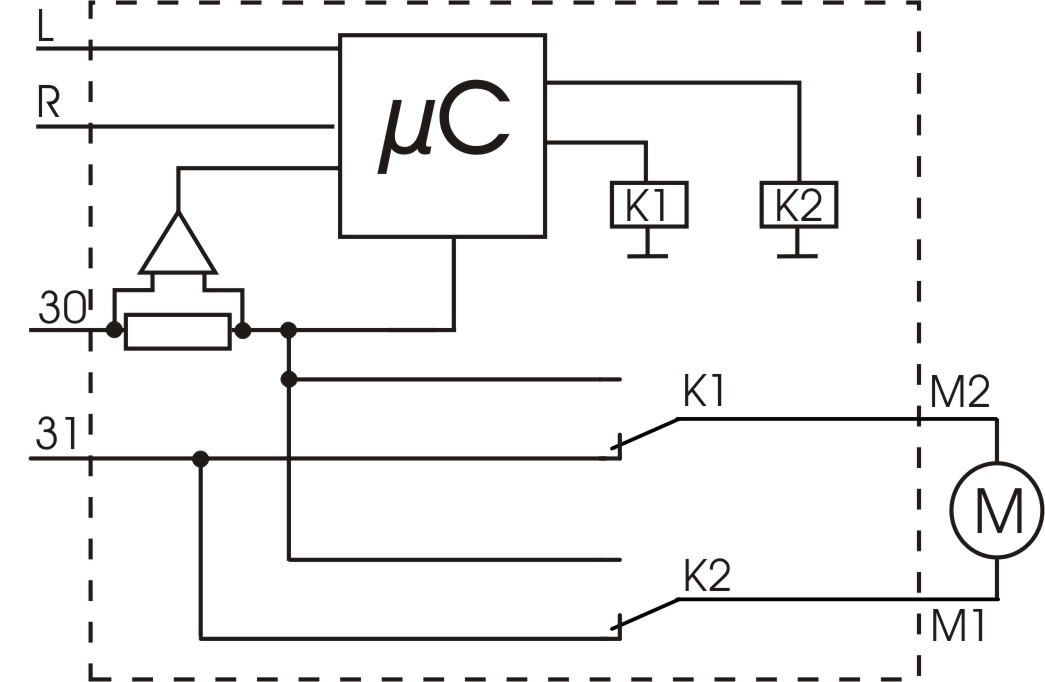 Die interne Überlastüberwachung schaltet den Motor bei der einstellten Überlast sofort aus. Die interne Schutzschaltung überwacht das gleichzeitige Beschalten der Eingänge L und R. Bei gleichzeitiger Beschaltung wird der Motorausgang sofort ausgeschaltet (Sperre). Die Überlastschwelle kann mittels eines stufenlosen Potentiometer von ca. 0,5A bis 10A (Toleranz +/-0,5A) eingestellt werden.