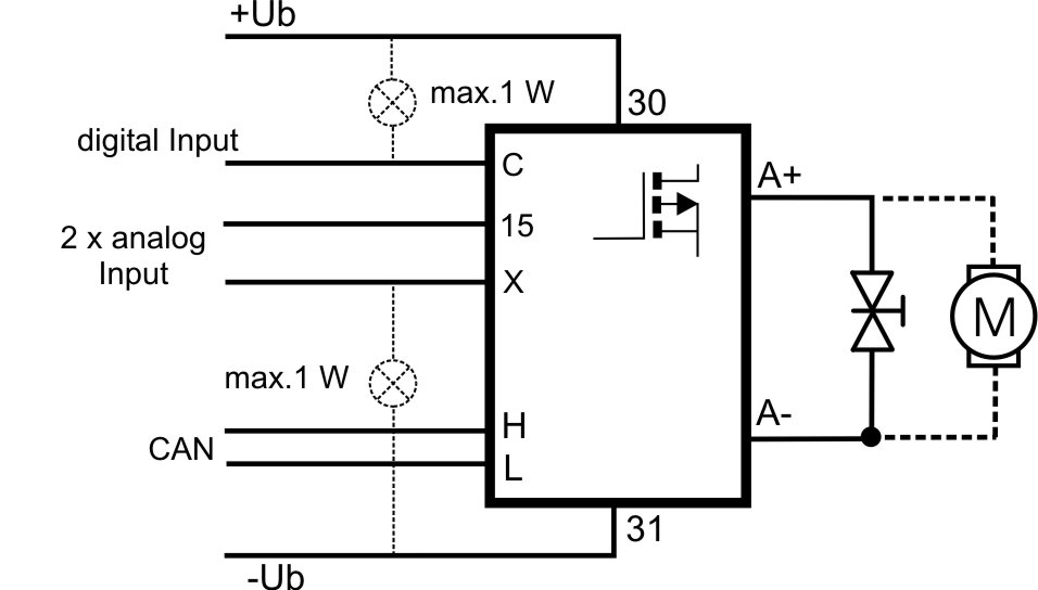 Der Proportional-Regler dient zur Durchflussmengen- regelung von Ventilen und kommt bei hydraulischen Anwendungen zum Einsatz, aber auch zur Lüftersteuerung, Drehzahl, Sanftanlauf. Der CAN -Bus ermöglicht den Datenaustausch zwischen den Modulen. CAN High- oder Low-Speed (RS232 optional) gewährleistet eine einfache Integration in vorhandene CAN-Systeme. Ansteuerung und Auslesen aller Werte per Bus möglich. Weitere Funktionen (IOs) sind frei programmierbar. Möglichkeit der kundeneigenen Programmierung mittels grafischer Programmieroberfläche CarsGraf©.