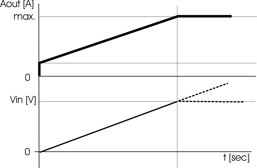 Stromregelung: über den Sollwert 0 - 10 Volt wird ein konstanter Ausgangsstrom eingestellt. Schwankungen der Betriebsspannung sowie Temperaturschwankungen werden ausgeglichen. Eine konstante Durchflussmenge ist dadurch gewährleistet. Es kann eine Ditherfrequenz überlagert werden, um ein Festsetzen des Ventils zu vermeiden. Stromregelungsbereich,