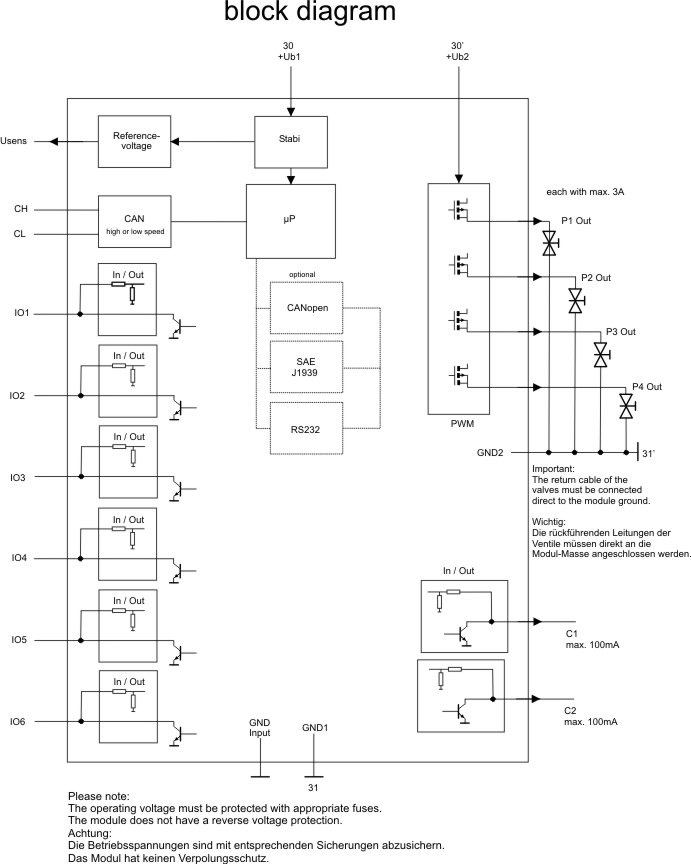 2x OC und CAN-Bus. Geeignet für Hydraulik und Automotiv-Anwendungen, zur Steuerung in Fahrzeugen, Maschinen, Kränen, Land- und Forstmaschinen und Baumaschinen (z.B. per Joystick). Möglichkeit der kundeneigenen Programmierung mittels
