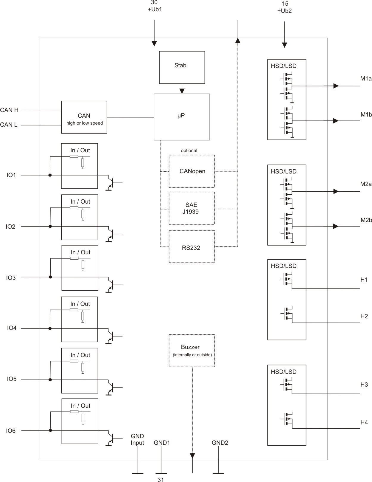 Steuereinheit für Zentralelektriken, Sicherungsüberwachung, Relaisansteuerung, Ausgangs-/Eingangserweiterungen, Anbindung binärer und analoger Sensorik über CAN-Bus.